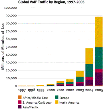 Tráfico mundial de voz sobre IP por región, 1997-2005
